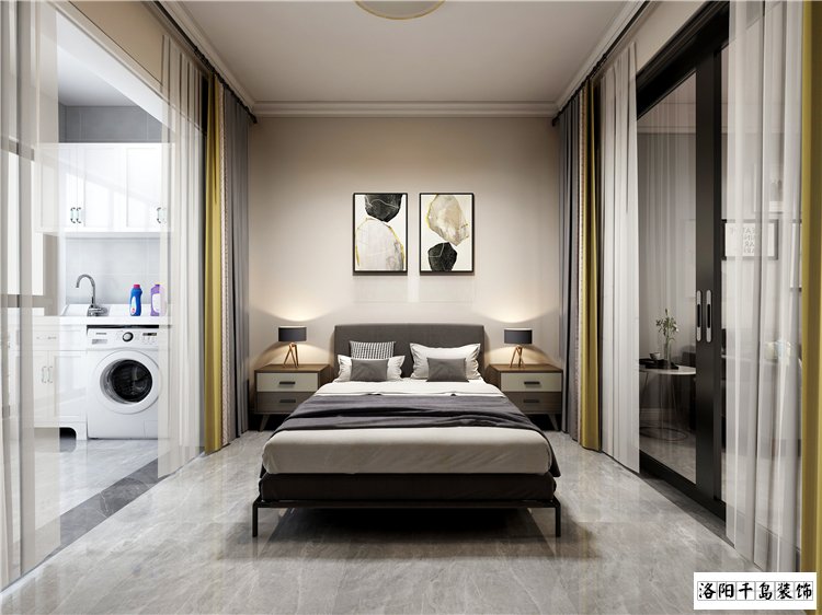 其實(shí),客廳被“擠”出一個房間后,采光通常就會受影響,這時候我們可以通過“借光”的方式來解決,通常的做法是使用玻璃磚或者鋼化玻璃來代替隔墻,本案例就是通過透明玻璃推拉門作為空間的分割,保證采光的同時,配合窗簾也有很好的封閉私密空間。